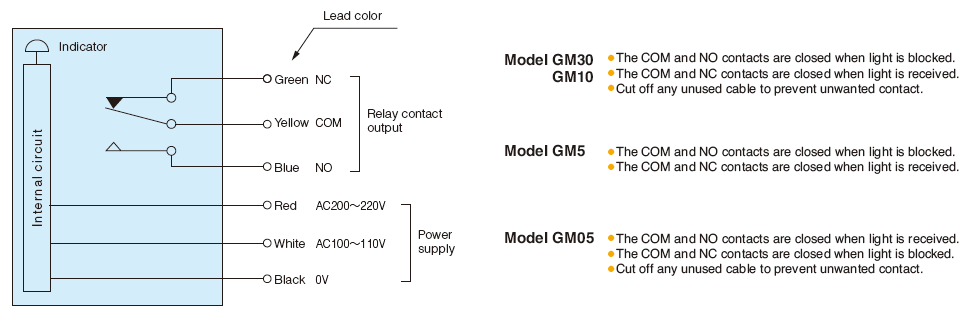 • All models provided with operation indicator (diffuse reflective model GM05 also with sensitivity adjustment)