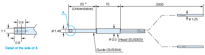 Side view φ1.48 head, 20 mm SUS tube with φ3 cylindrical unit
