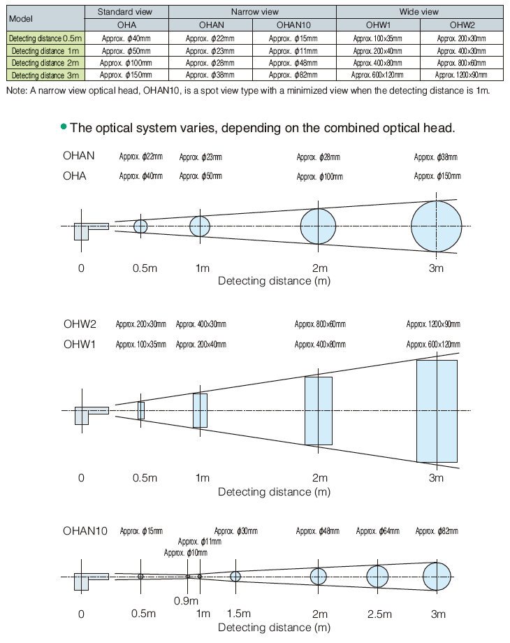 Guidelines are given below for the temperature of a detection object larger than the detecting field of view with optical head (OHA) and fiber optic cable (FG2) used for detection.