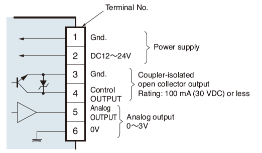 Note) The open collector output is isolated from power supply. The analog output “0” and “0” of power supply have different potentials. Do not common.